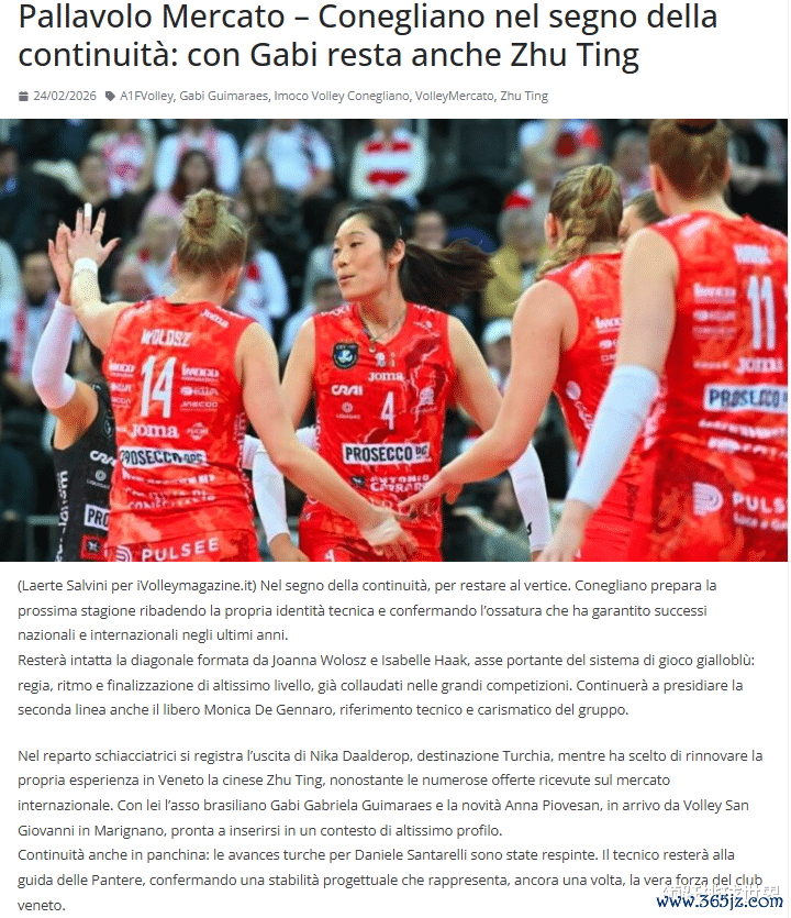 更具看点的,是中国女排奥运冠军MVP、主攻手朱婷的续约决定,在国际转会市场上始终备受追逐的她,被多家俱乐部保价争抢,但最终选择继续留在科内利亚诺,这本身就是对俱乐部环境与竞技体系的高度认可。